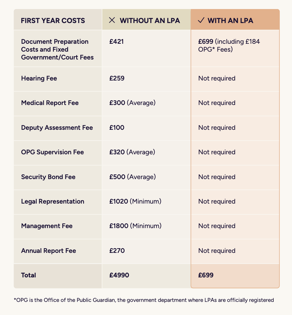 But the biggest difference isn't the money. It's the time. While a deputyship application works its way through the Court of Protection for months, your family may be unable to access your bank accounts, pay your mortgage, or arrange your care. An LPA avoids all of that.